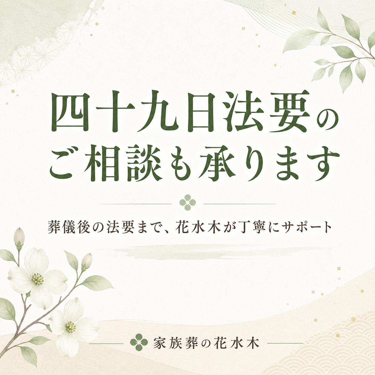 法要について不安がある方、葬儀後に何をすればよいか分からない方、法要だけ相談できる場所を探している方は、どうぞ遠慮なく家族葬の花水木までご相談ください。